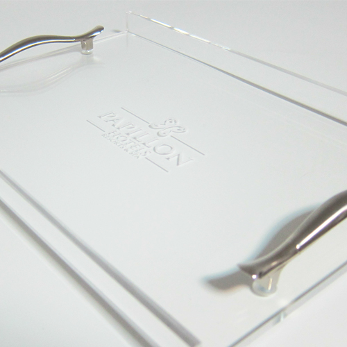 Pleksi Buklet Tepsi Pleksi renkli veya renksiz kullanılabilen saydam veya yarı saydam çeşitleri bulunan plastik esaslı cam görünümlü levhadır. İşlenerek şekil verilebilen bir yapıya sahiptir. piyasada genellikle 3 mm kalınlığında levhalar halinde bulunur. 115 derecelik ısılarda etüve edilerek yumuşutalırı ve şekil verilir. Camdan 6 kat daha dayanıklı bir yapısı olmasına rağmen sert malzemelerden çok daha kolay işlenebilir. Işık geçirgenliği yüksek ve darbelere karşı oldukça dayanıklıdır. bu sayede iç ve dış mekanlarda rahatlıkla kullanılabilir. gövde üzerine metal kulplar monte edilerek oluşturulmuştur. Gövde üzerine talep eden firmanın konseptine uygun olarak yazı ve logo uygulaması yapılabilmektedir.